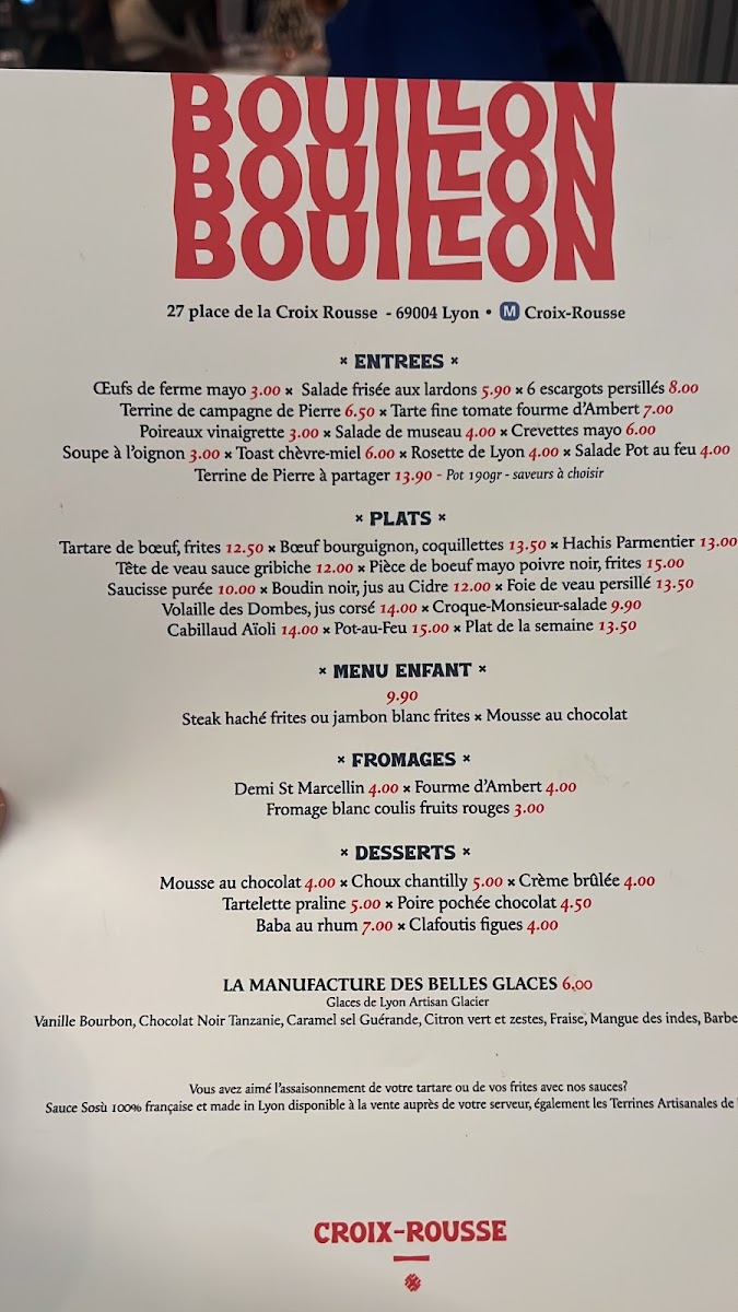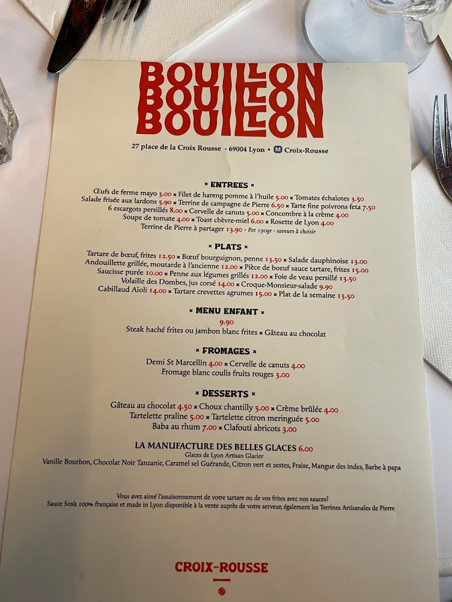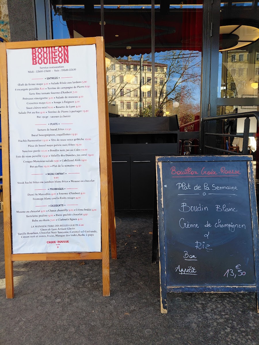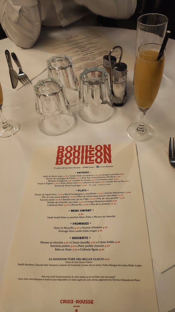 Bouillon Croix-Rousse is a charming French bistro nestled in the heart of Lyon at 27 Pl. de la Croix-Rousse. The menu offers a delightful journey through classic Lyonnaise cuisine, blending rustic country flavors with refined techniques. Start with standout entrées like the perfectly executed œufs de ferme mayo or the rich, garlicky 6 escargots persillés. Their Tarte fine tomate fourme Ambert provides a delicate balance of creamy cheese and fresh tomato, embodying the region’s terroir. For mains, the steak tartare with frites shines with fresh, bold flavors, while the hearty boeuf bourguignon and traditional hachis parmentier showcase comforting French classics done right. Desserts such as the crème brûlée have won praise for their flawless texture and sweetness. With attentive service and a warm atmosphere, Bouillon Croix-Rousse is an authentic Lyonnaise dining experience that invites you to savor every bite. A must-visit gem for lovers of true French brasserie fare.