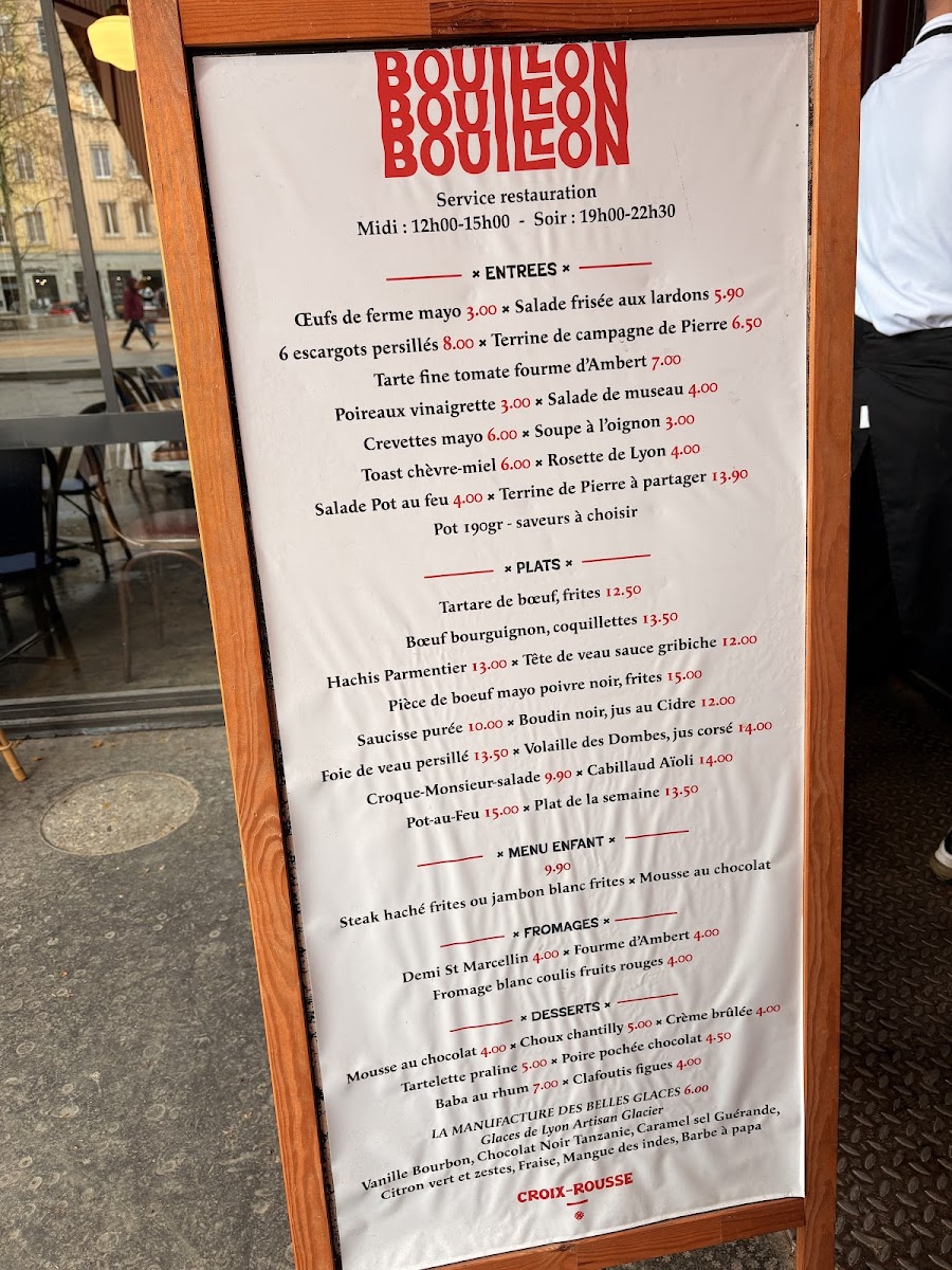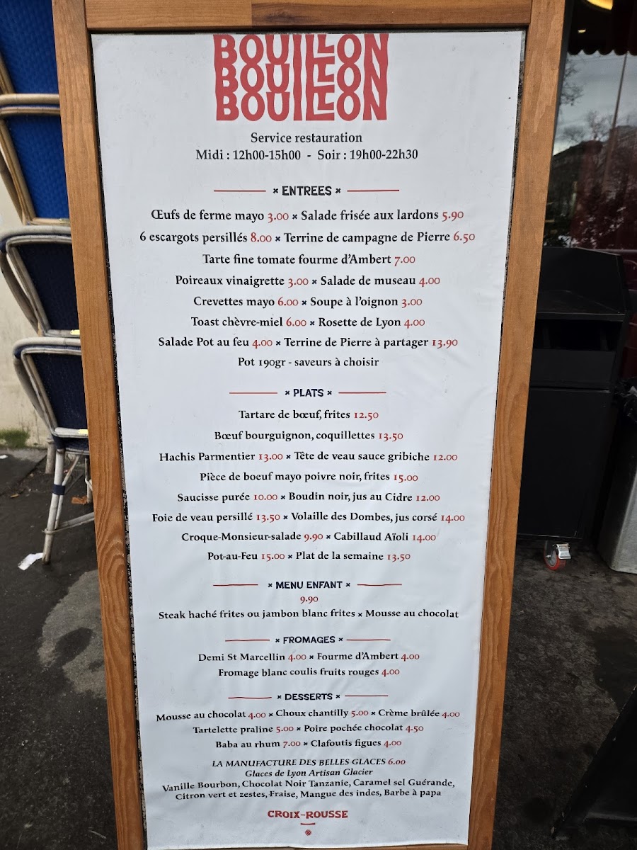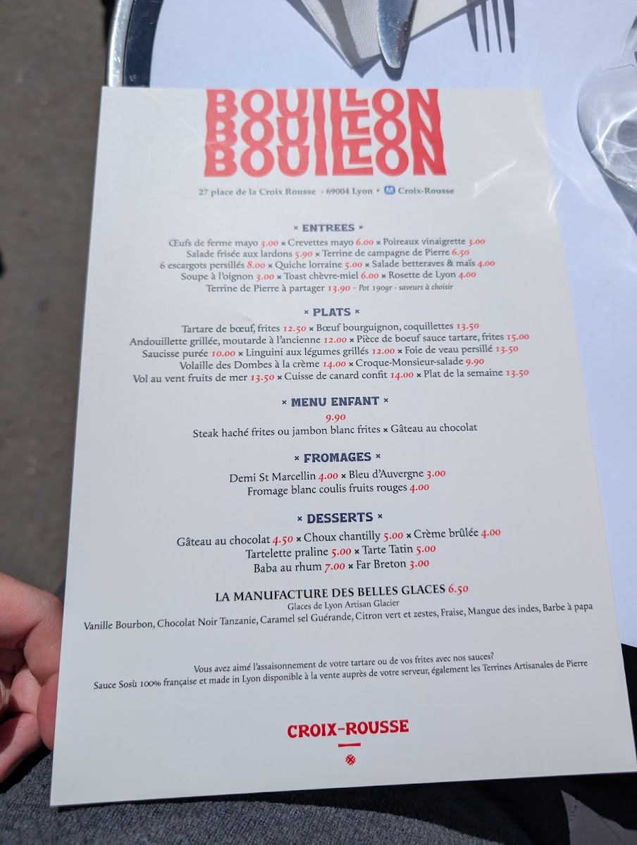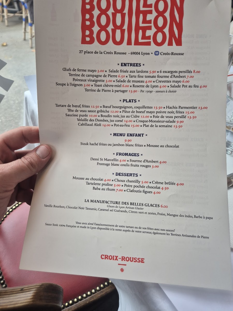 Bouillon Croix-Rousse is a charming French bistro nestled in the heart of Lyon at 27 Pl. de la Croix-Rousse. The menu offers a delightful journey through classic Lyonnaise cuisine, blending rustic country flavors with refined techniques. Start with standout entrées like the perfectly executed œufs de ferme mayo or the rich, garlicky 6 escargots persillés. Their Tarte fine tomate fourme Ambert provides a delicate balance of creamy cheese and fresh tomato, embodying the region’s terroir. For mains, the steak tartare with frites shines with fresh, bold flavors, while the hearty boeuf bourguignon and traditional hachis parmentier showcase comforting French classics done right. Desserts such as the crème brûlée have won praise for their flawless texture and sweetness. With attentive service and a warm atmosphere, Bouillon Croix-Rousse is an authentic Lyonnaise dining experience that invites you to savor every bite. A must-visit gem for lovers of true French brasserie fare.
